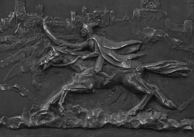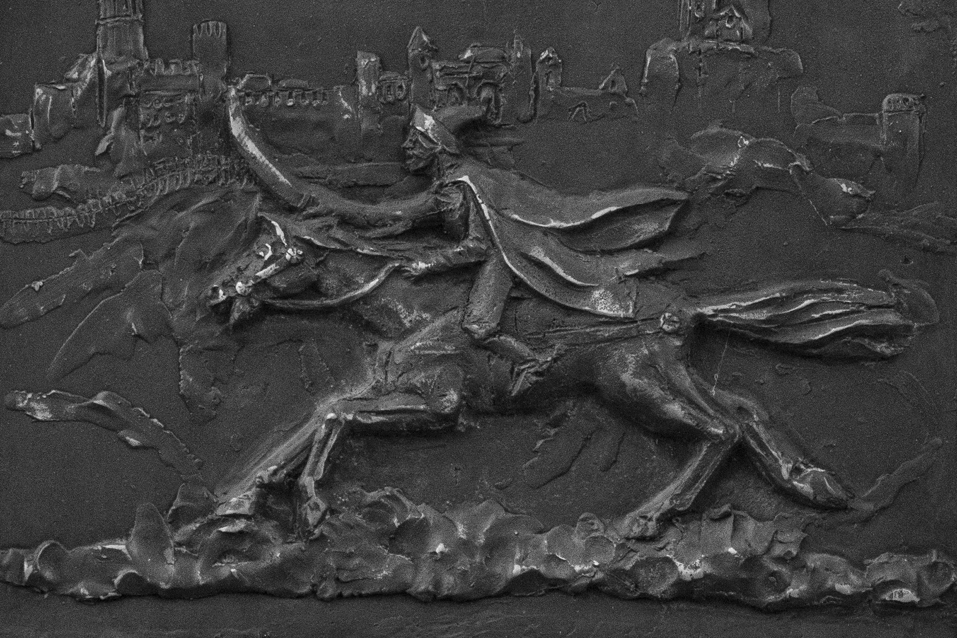 Az emléktábla a Várkapu tövében található, bal kéz felől, a falon. A dombormű egy lóháton vágtató huszárt ábrázol, kivont kardjával.