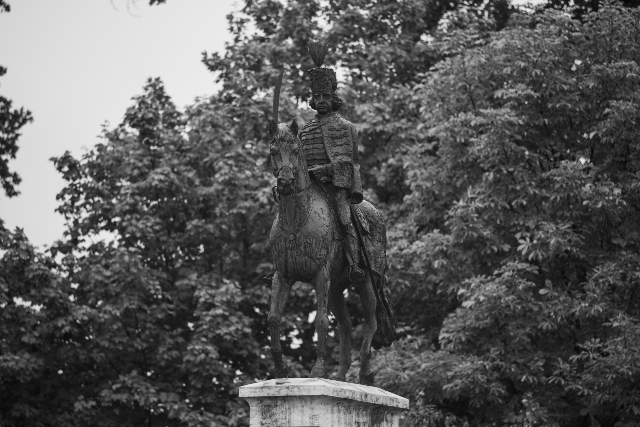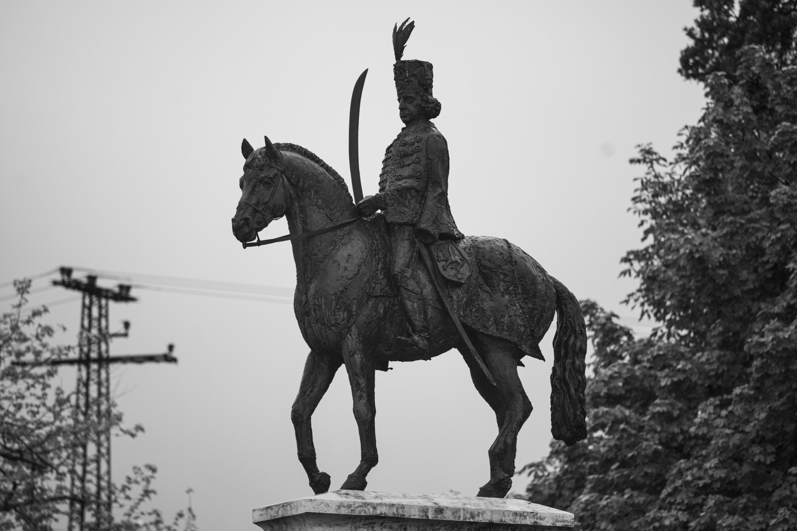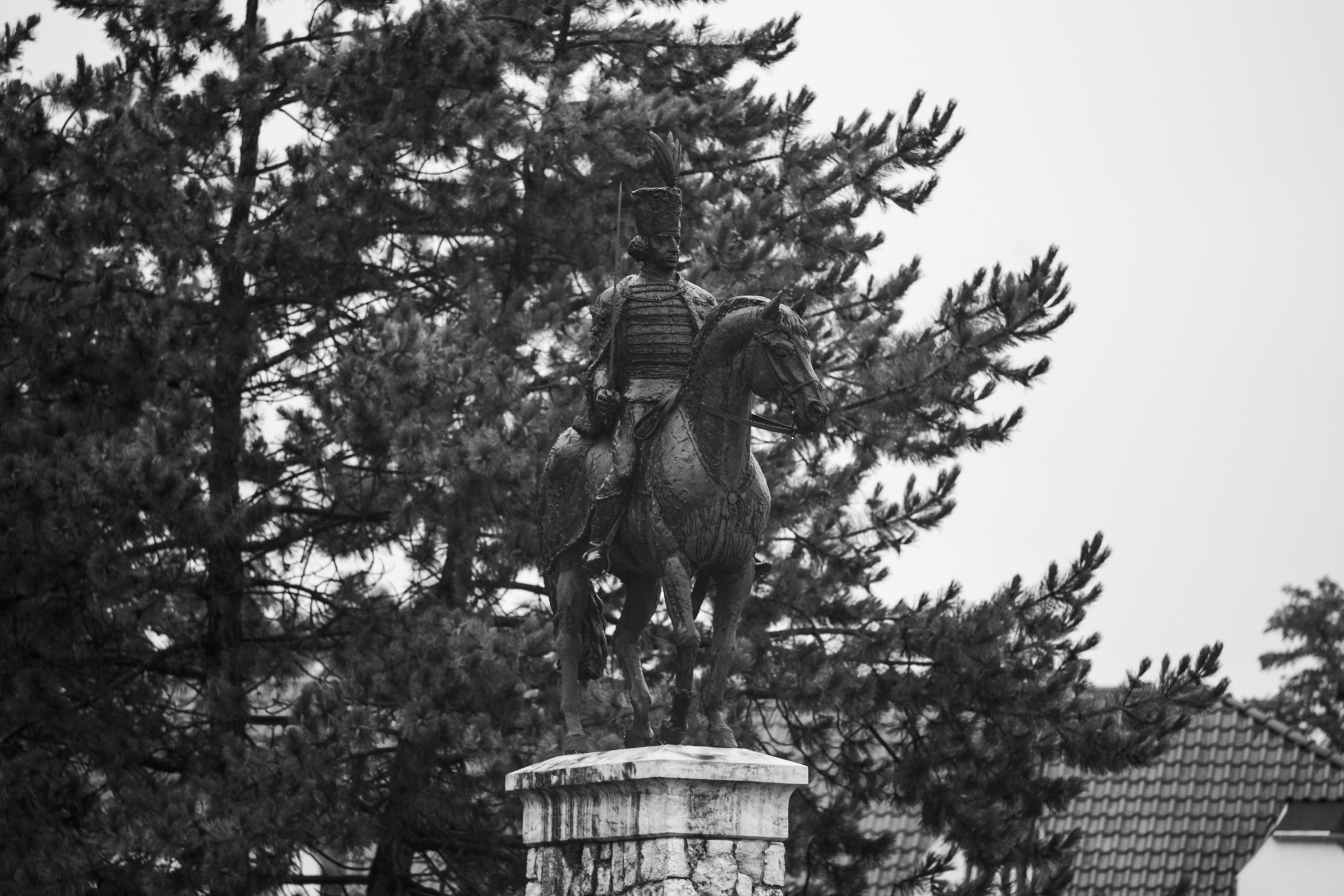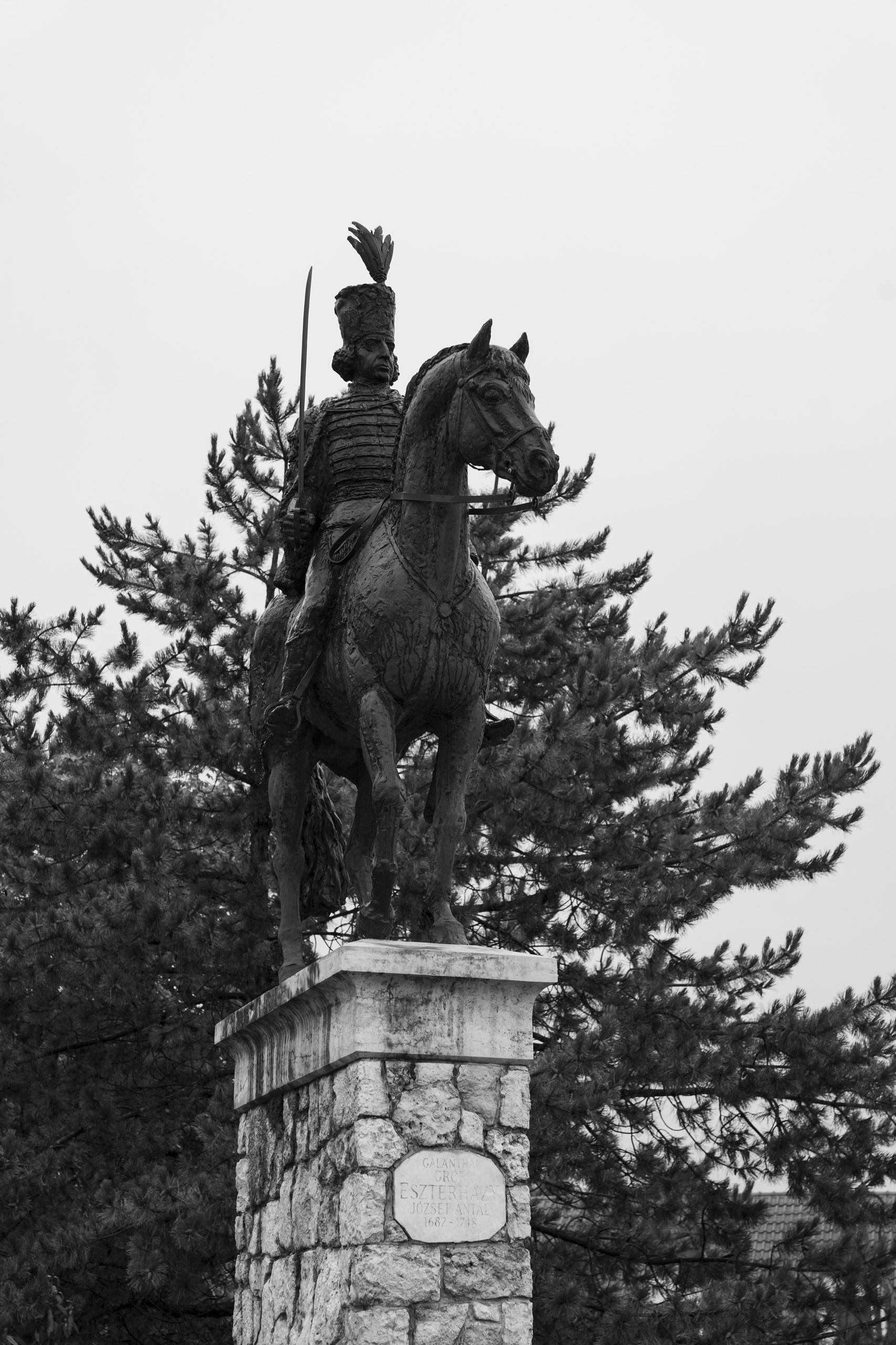 A keskeny posztamensen álló lovas huszár, egyenruhában, kivont karddal tisztelegve szemléli Vértes és Gerecse lábánál fekvő települést,