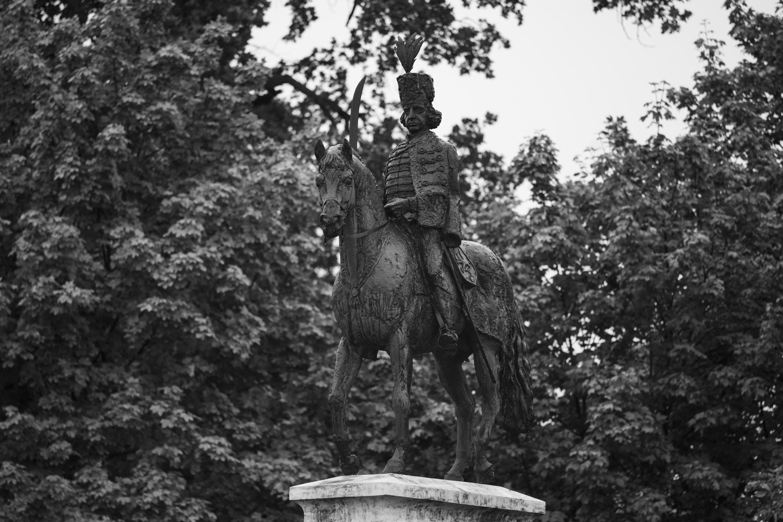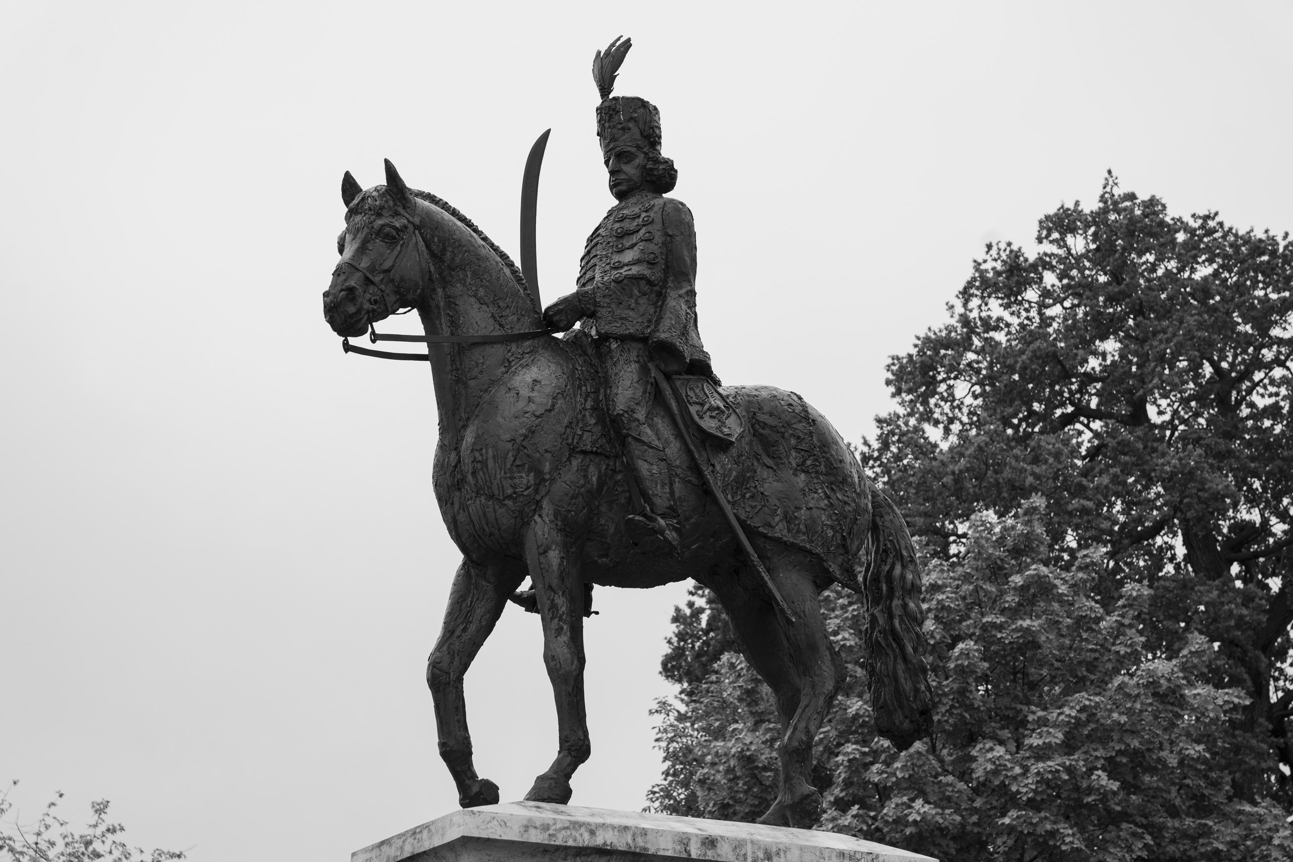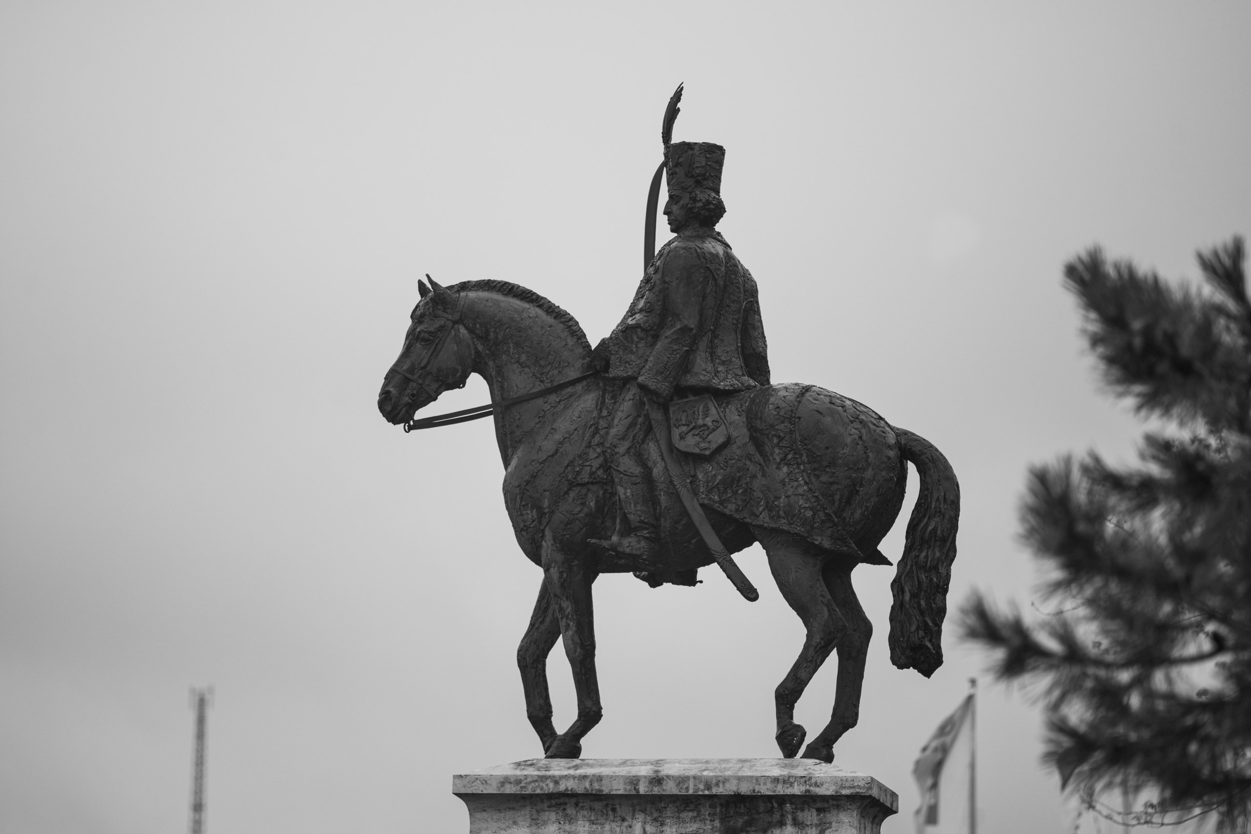 A keskeny posztamensen álló lovas huszár, egyenruhában, kivont karddal tisztelegve szemléli Vértes és Gerecse lábánál fekvő települést,