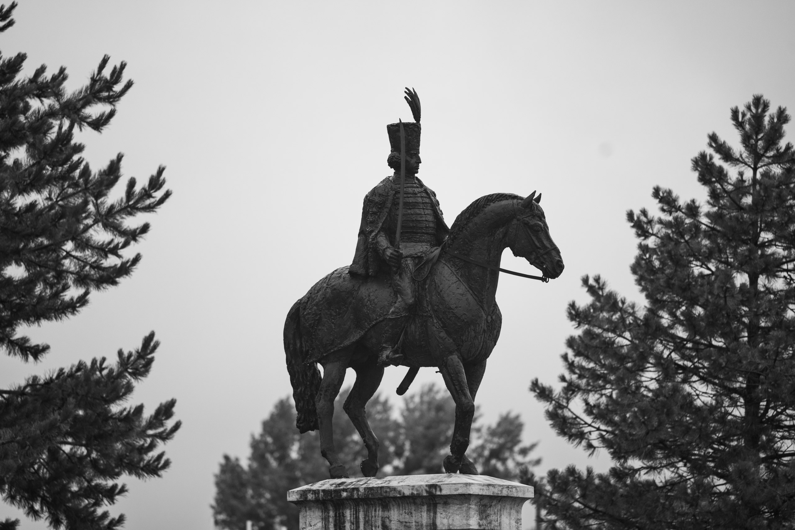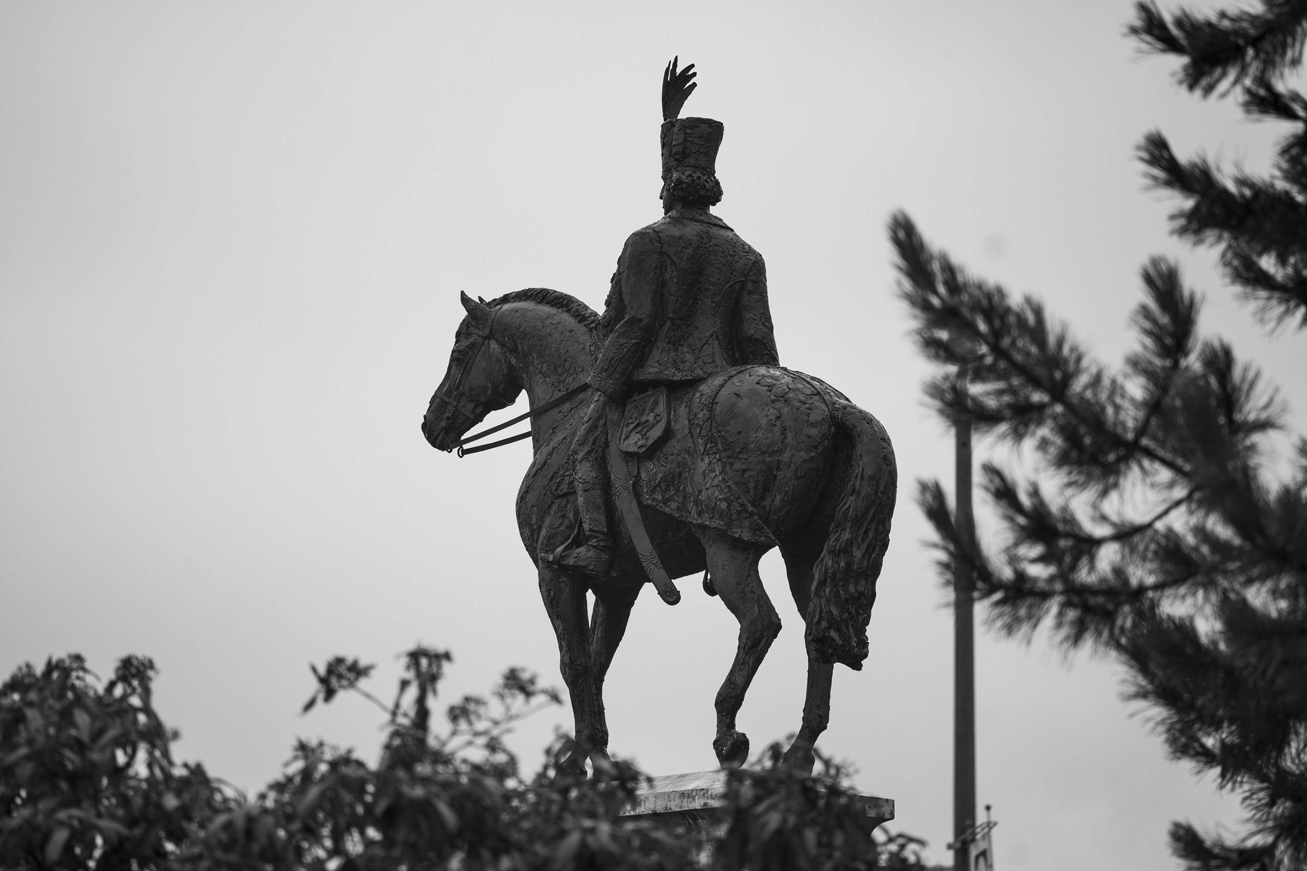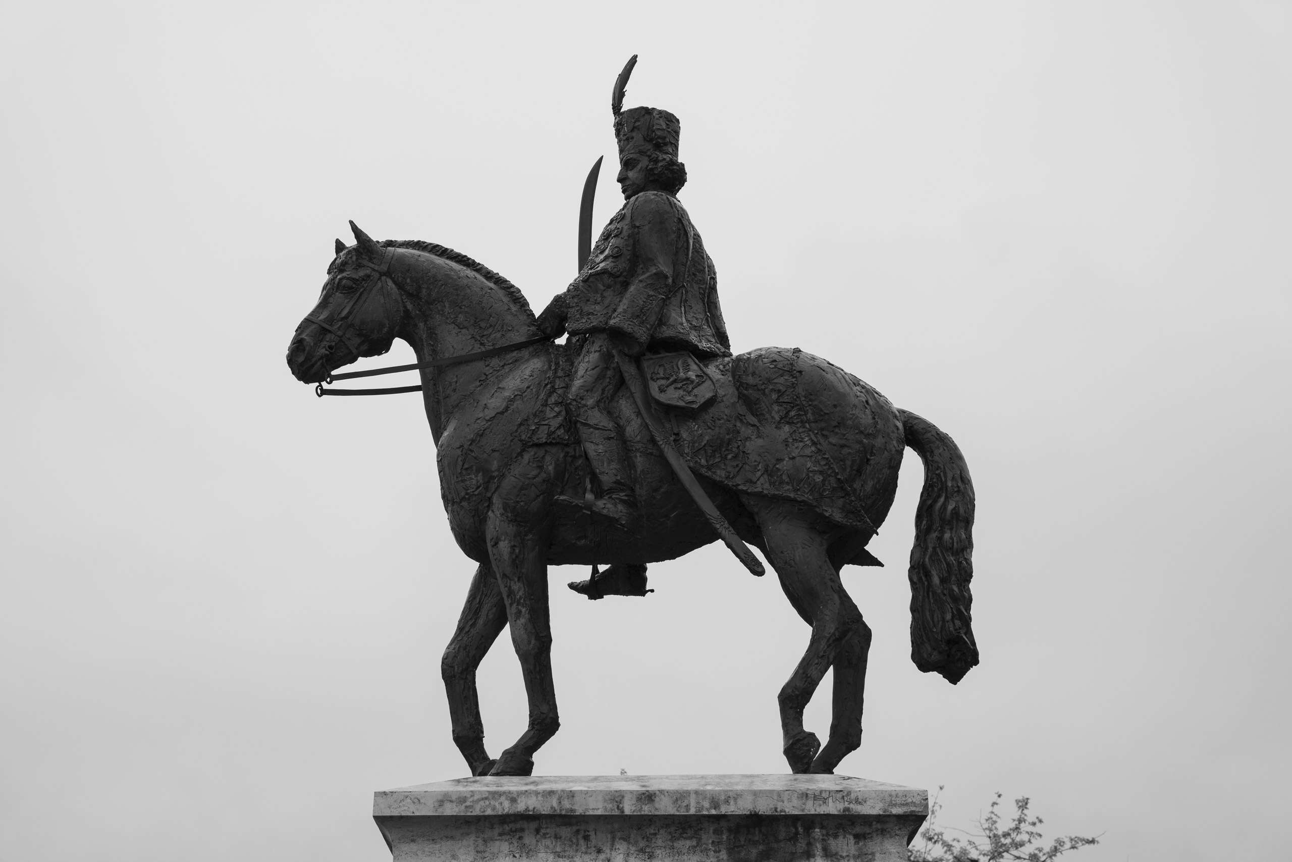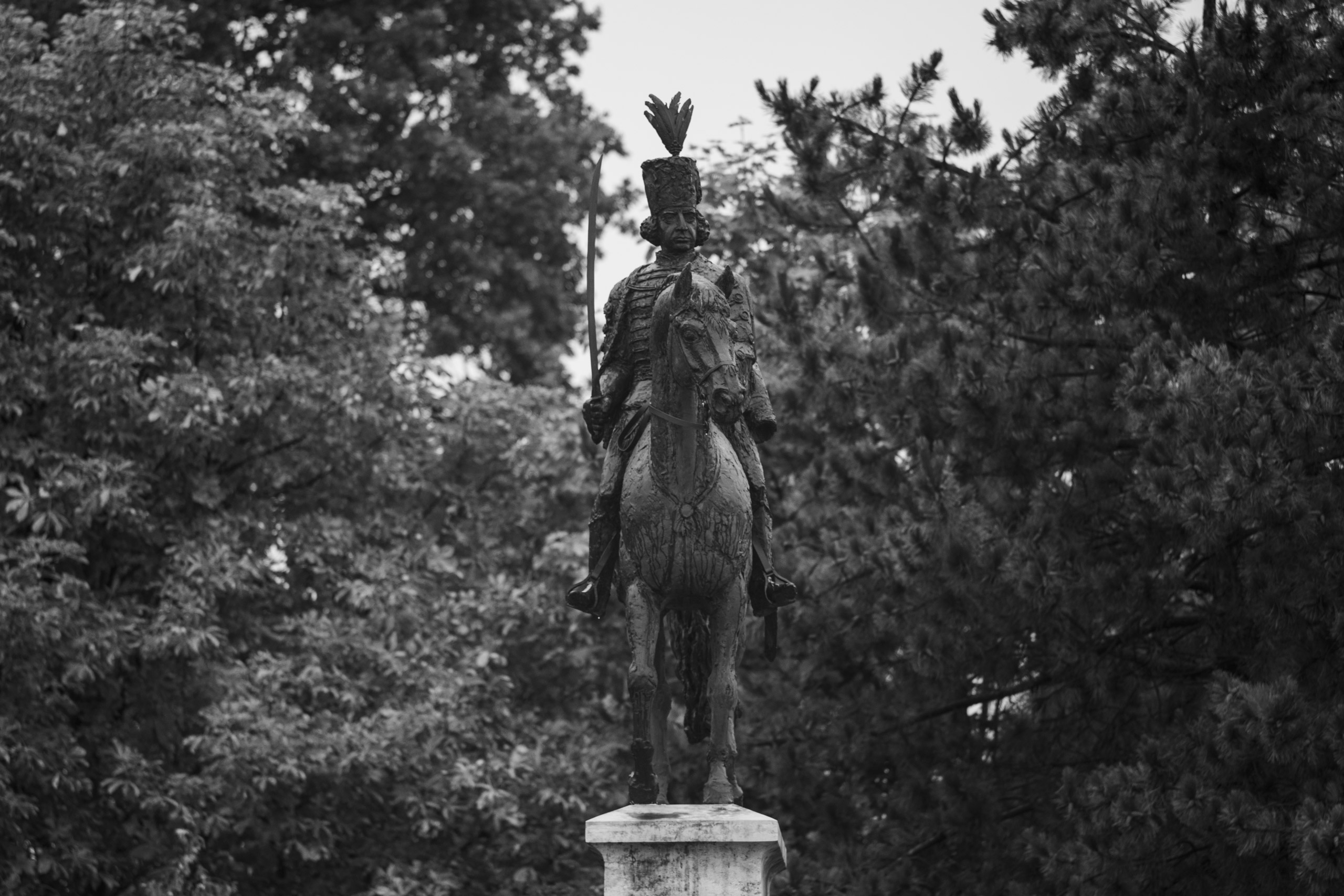 A keskeny posztamensen álló lovas huszár, egyenruhában, kivont karddal tisztelegve szemléli Vértes és Gerecse lábánál fekvő települést,