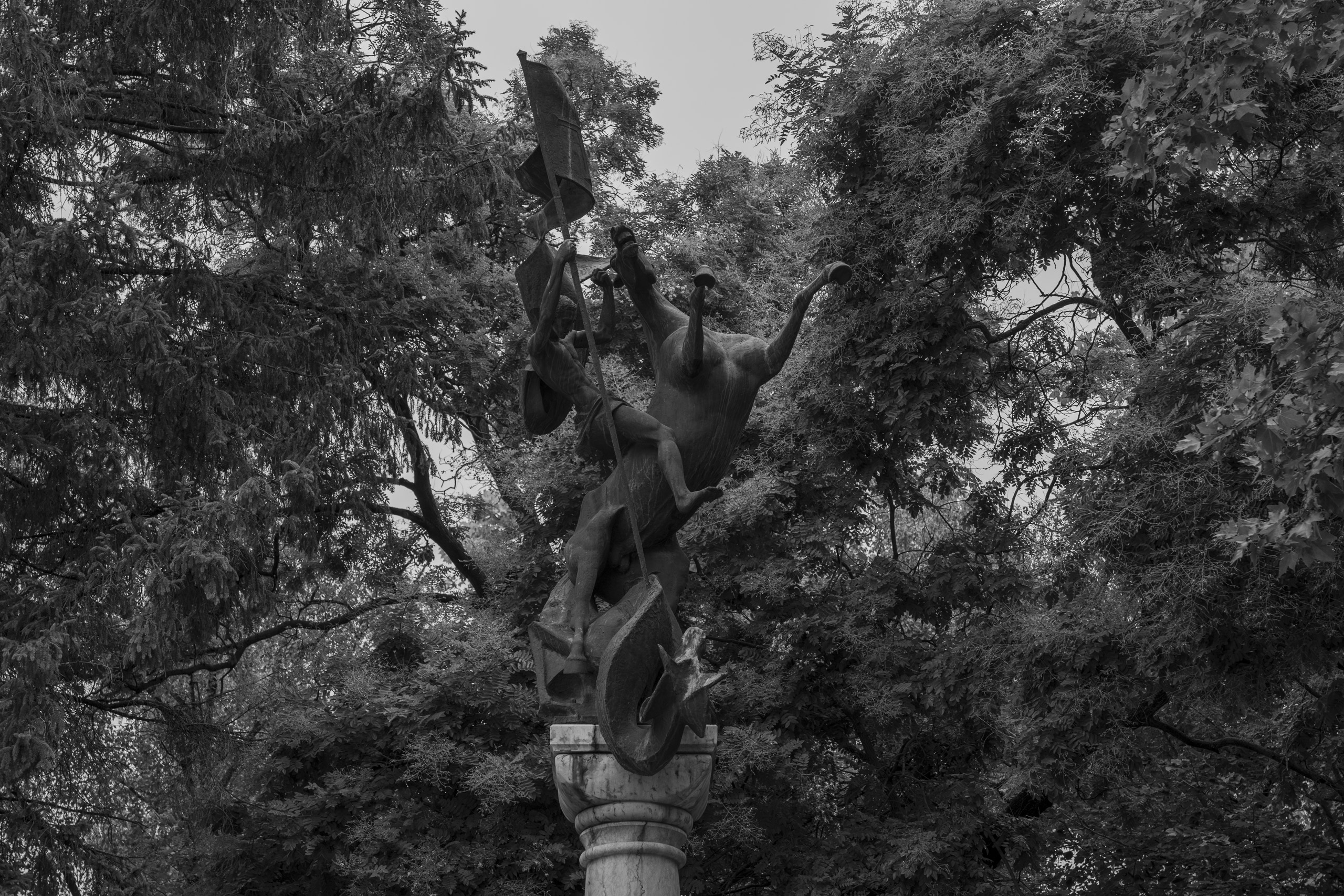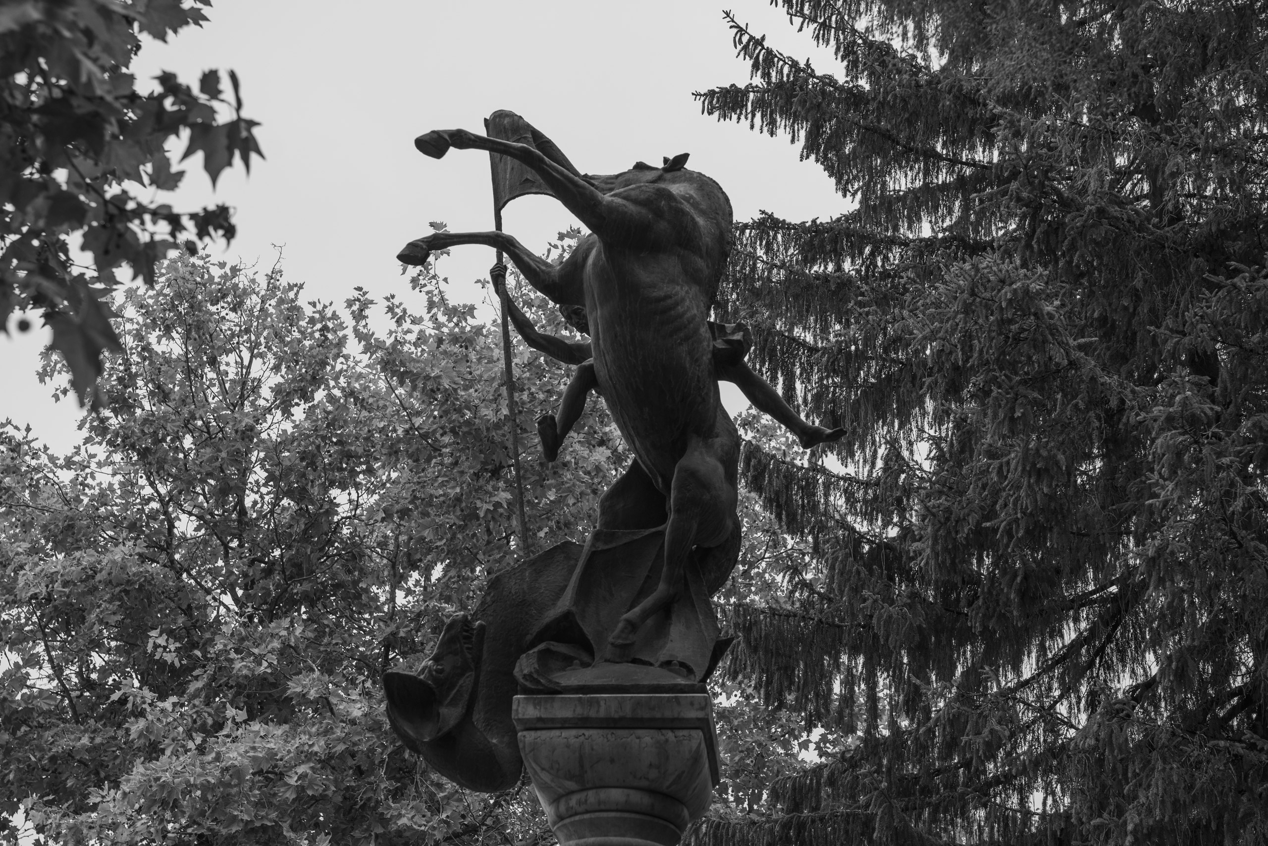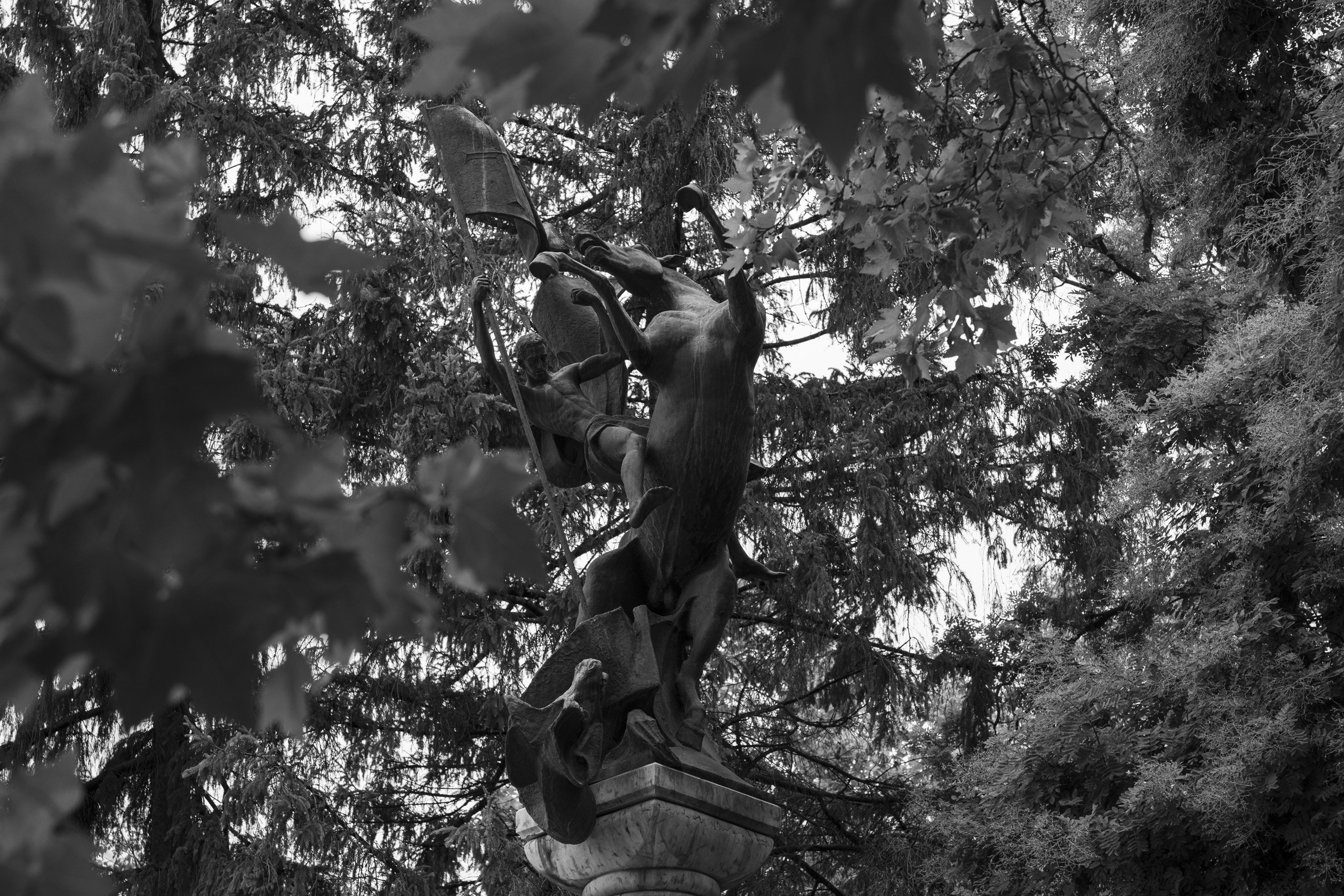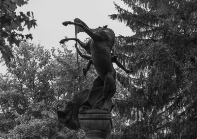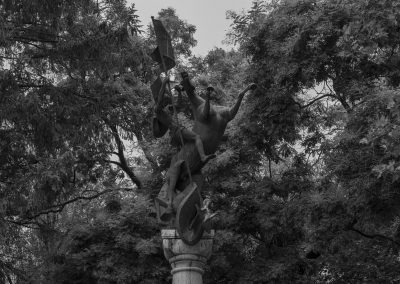 Márvány oszlopon a sárkányt legyőző Szent György bronz szobra látható, az oszlopon több bronzgyűrűn feliratozva az áldozatok nevei olvashatók
